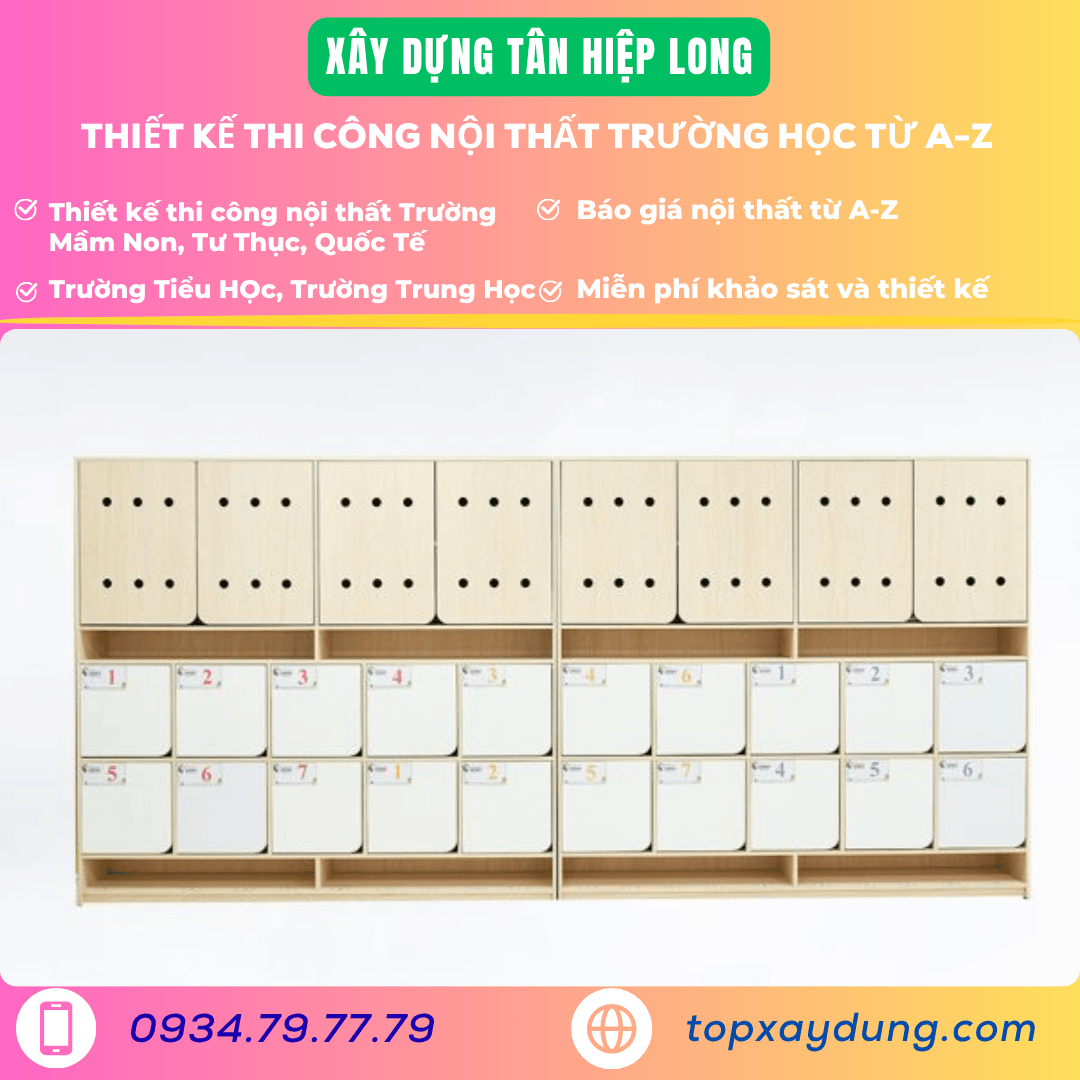 Mô tả: Kệ thấp, nhiều ngăn riêng cho từng bé, vật liệu gỗ MDF hoặc gỗ thịt nhẹ.