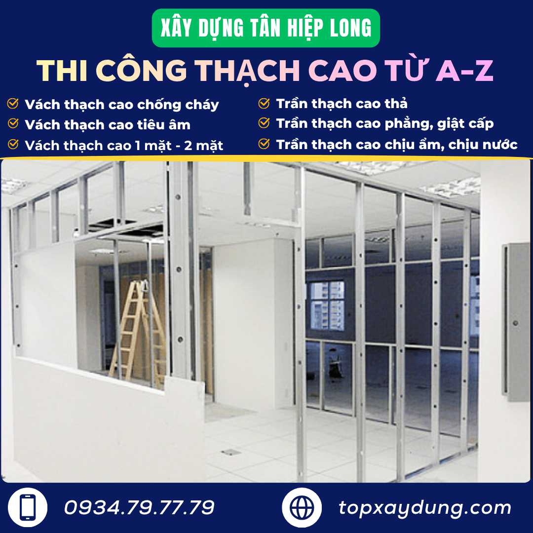 Đội ngũ thi công chuyên nghiệp: lắp hệ khung xương, tấm thạch cao, xử lý mối nối và sơn bả hoàn thiện.