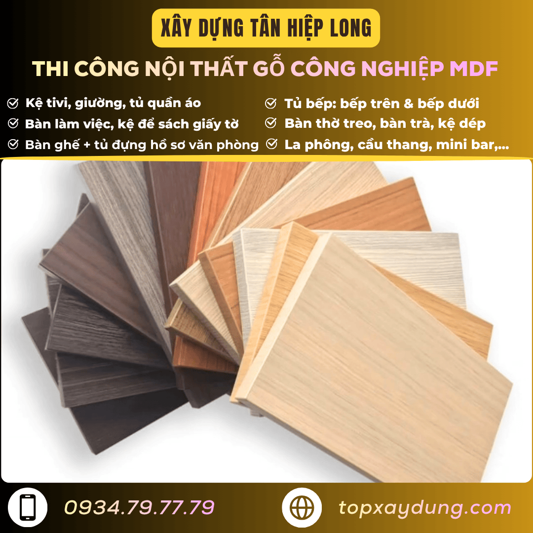 Tại Xây Dựng Tân Hiệp Long, chúng tôi chuyên cung cấp dịch vụ thi công nội thất gỗ công nghiệp MDF giá xưởng tại Trà Vinh, với đội ngũ thiết kế chuyên sâu, xưởng sản xuất hiện đại và báo giá minh bạch — tất cả nhằm giúp khách hàng tại các thị xã, phường, huyện, xã trong Tỉnh Trà Vinh dễ dàng tiếp cận và thực hiện dự án nội thất của mình. Hãy liên hệ ngay Hotline/Zalo: 0934.79.77.79 để nhận báo giá nội thất gỗ công nghiệp tại Trà Vinh và được tư vấn chi tiết.