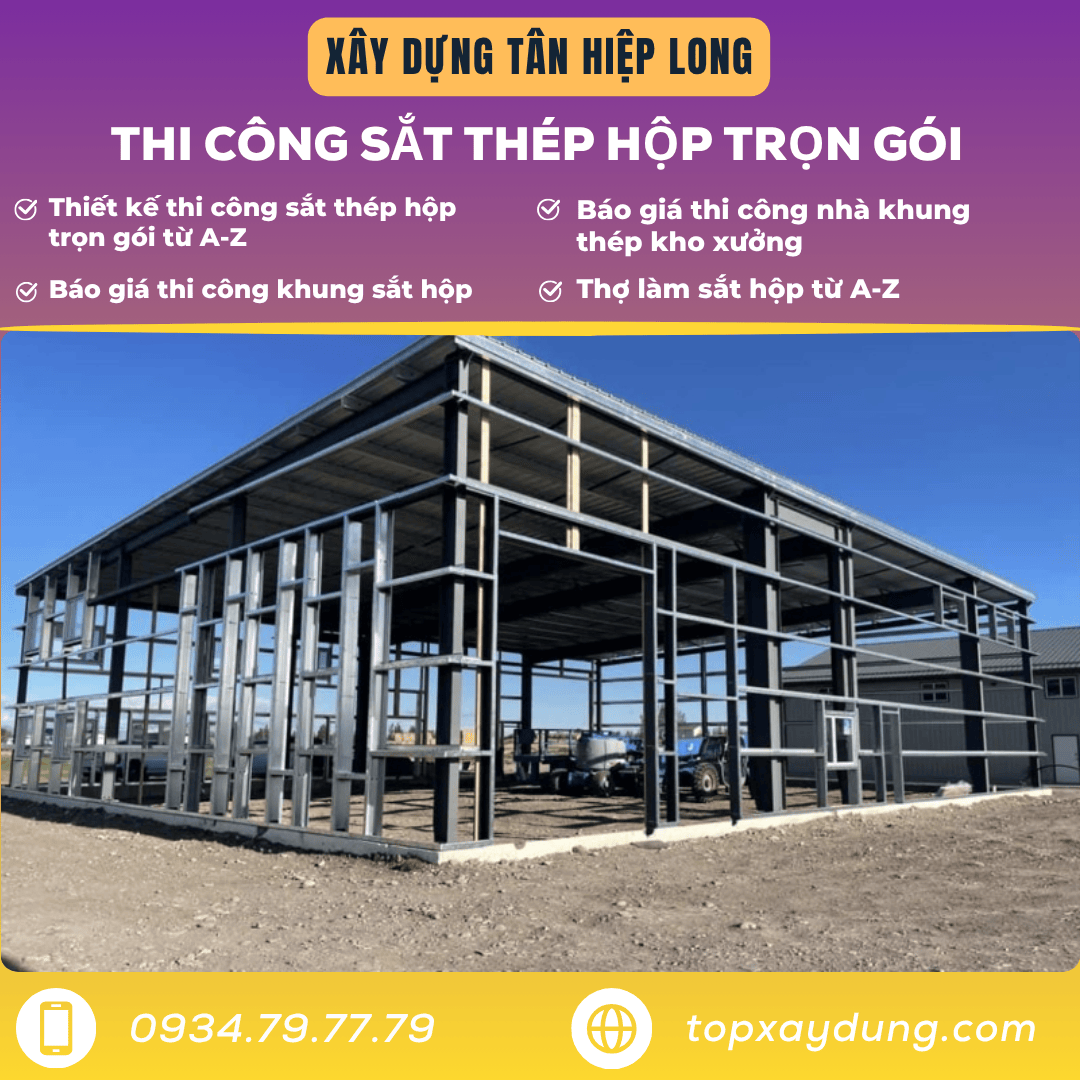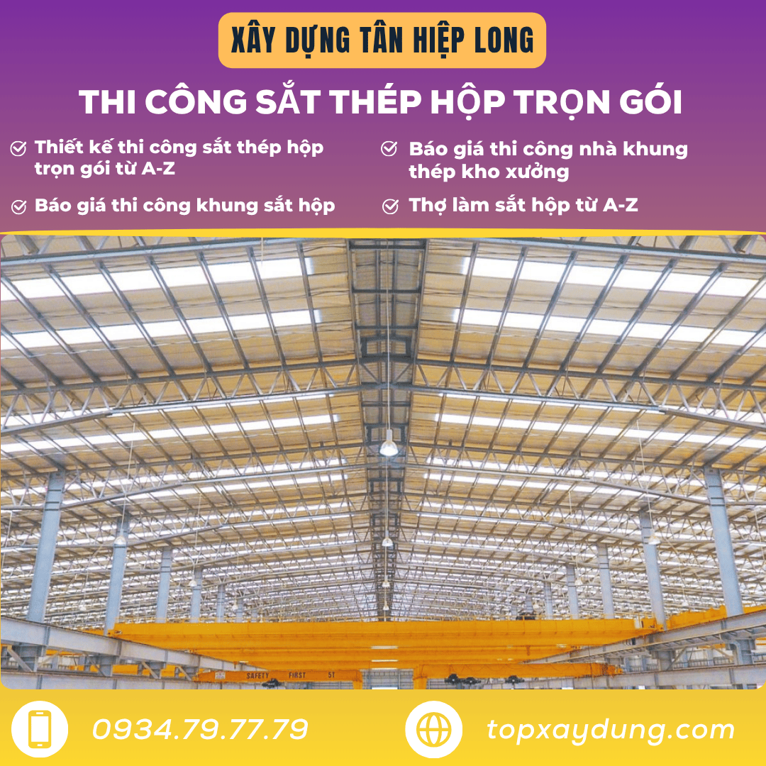 Bạn đang tìm báo giá thi công khung sắt hộp Tp.HCM? Bạn cần thợ làm sắt hộp trọn gói giá rẻ Tp.HCM để làm nhà bằng sắt hộp, làm nhà khung sắt mái tôn, thi công nhà thép tiền chế, hay thi công khung sắt hộp làm gác lửng, kệ – bàn ghế – tủ tại TP. HCM? Hãy dừng lại – bạn vừa tìm đúng đối tác uy tín. Xây Dựng Tân Hiệp Long là công ty chuyên thi công sắt thép hộp trọn gói tại TP. Hồ Chí Minh (Quận 1, 2, 3… đến Huyện Củ Chi, Nhà Bè, Bình Chánh…), cam kết giá cạnh tranh, chất lượng cao, bảo hành rõ ràng. Liên hệ ngay Hotline/Zalo: 0934.79.77.79 để được tư vấn và nhận báo giá chi tiết.