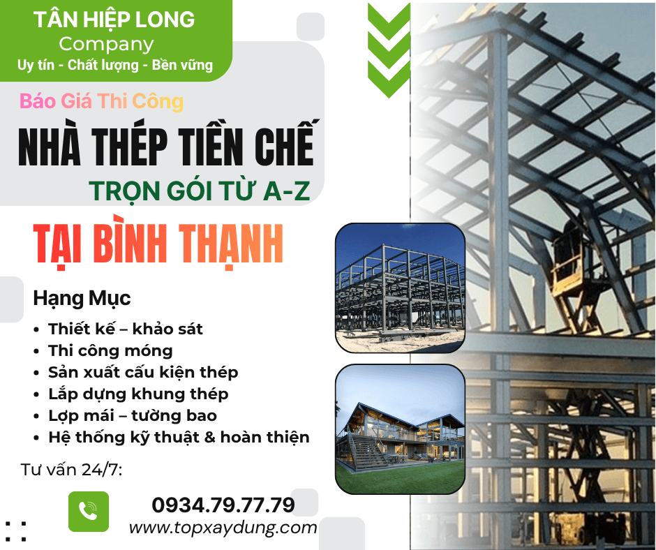 Nếu bạn đang tìm đơn vị thi công nhà thép tiền chế uy tín Bình Thạnh, thì Tân Hiệp Long chính là lựa chọn lý tưởng. Chúng tôi chuyên thiết kế thi công nhà thép tiền chế Bình Thạnh trọn gói, đảm bảo chất lượng công trình, tiến độ nhanh và chi phí tối ưu cho khách hàng.