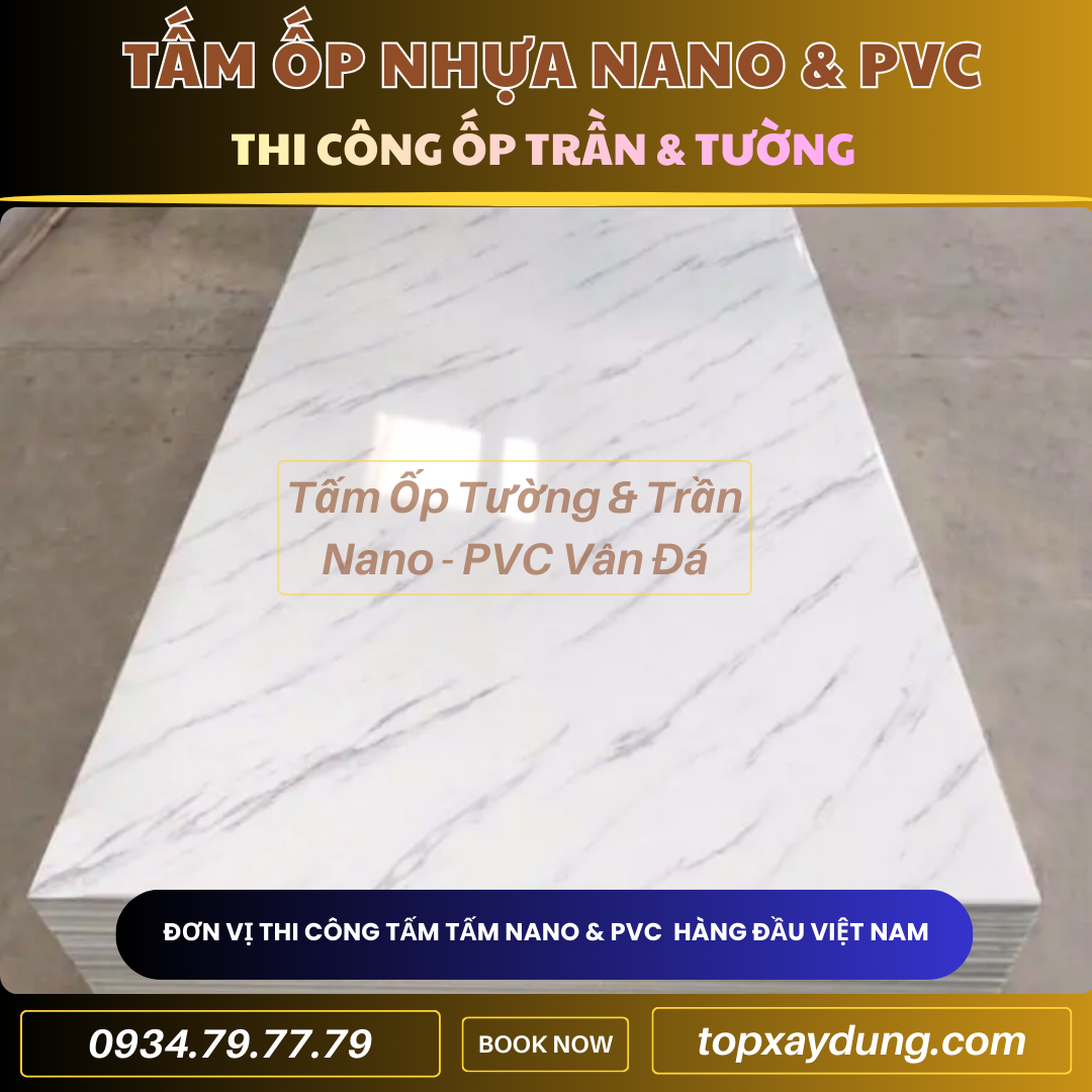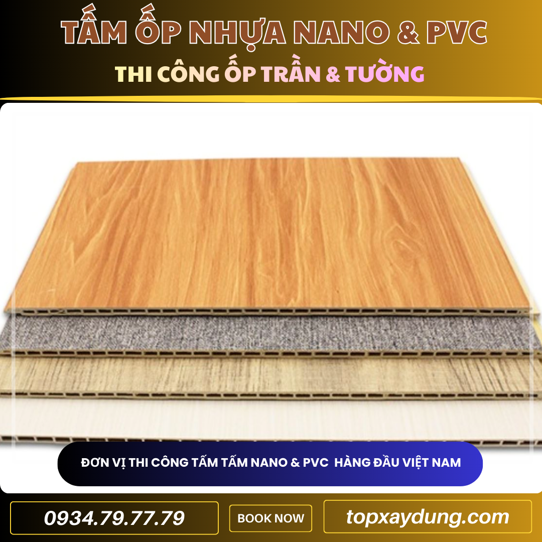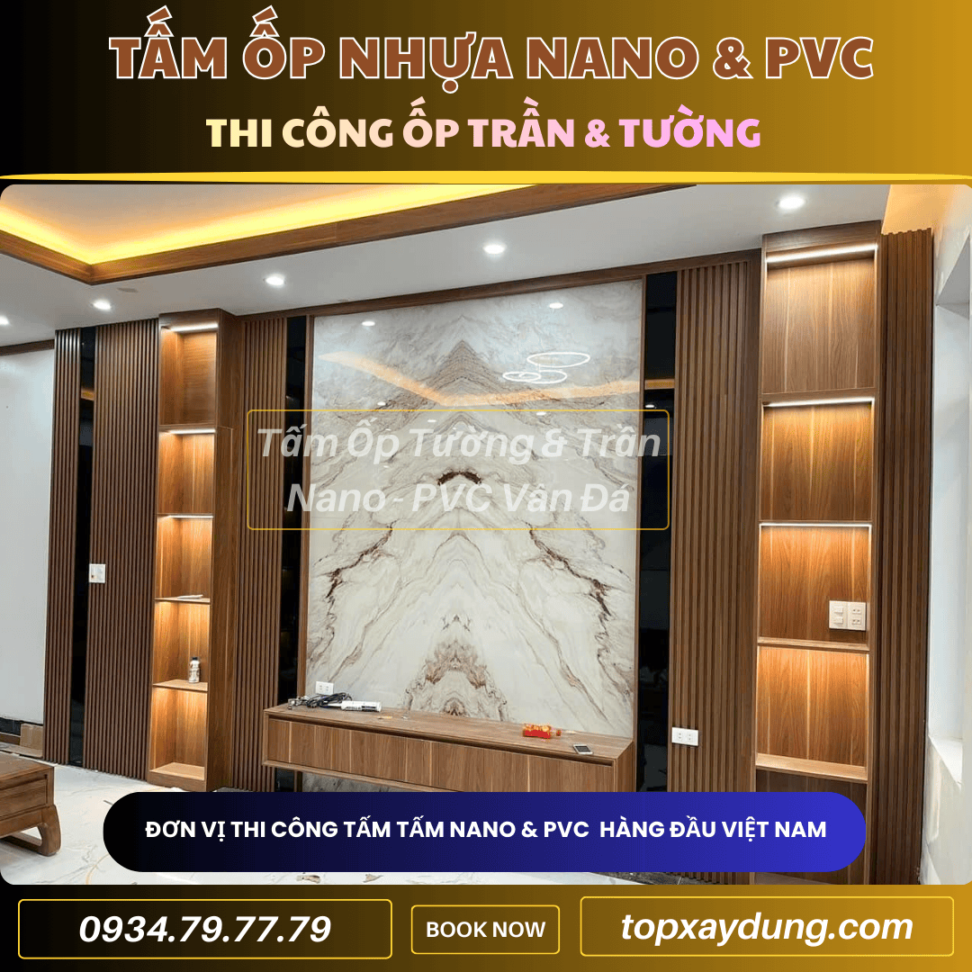 Thiết kế thi công ốp trần & tường nhựa PVC Nano phẳng trọn gói giá rẻ, bền đẹp, chống ẩm mốc, dễ vệ sinh. Báo giá nhanh – thi công chuẩn. Hotline 0934797779